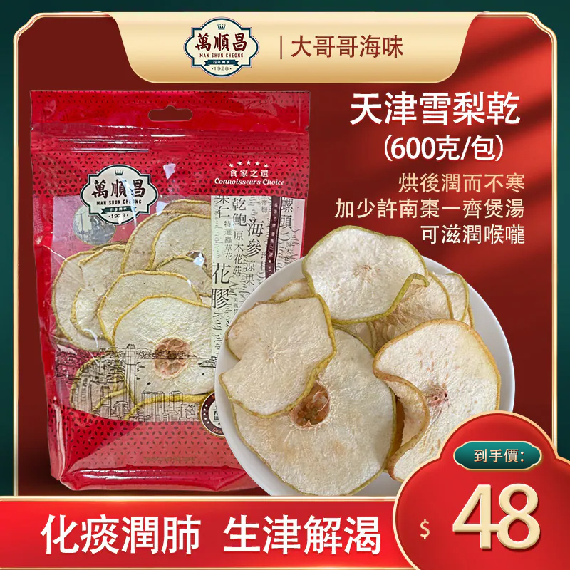 天津雪梨乾 (1斤/600克) 天津出產的雪梨乾鮮甜😋,是頂級的雪梨👑,經焗乾後👍🏻,不會太寒涼😍,而且有潤肺清燥🙂、止咳化痰💚、養血生肌的功效🥳。 儲存方法: 雪櫃 功效: 化痰潤肺,生津解渴,雪梨乾烘後潤而不寒 雪梨乾烘後潤而不寒,加少許南棗一齊煲又可以補補佢!雪梨乾能潤肺、化痰、止渴!喉嚨乾想滋潤一下可以煲呢款水飲呀! 材料(1-2人): 雪梨乾 6片,無花果 5粒,南棗 3粒,南北杏 1湯羹,冰糖 (可以唔落) 20g,水 1400ml 做法: 1)將所有材料洗乾淨, 2)水滾後下材大火煲10分鐘,之後轉細火煲30分鐘,熄火焗30分鐘即可飲用(唔好太熱飲😉) |